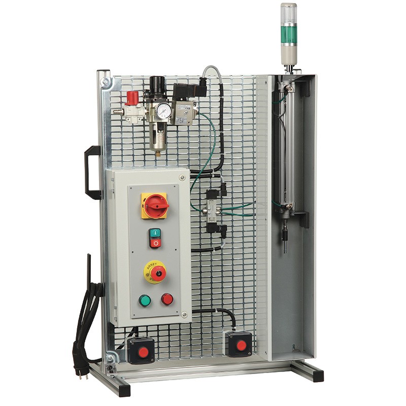 Compacte, à poser sur une table, cette maquette représente une machine industrielle à actionnement pneumatique telle que l’on peut retrouver sur une ligne de production (presse, poste de perçage, poste de vissage, bridage…)