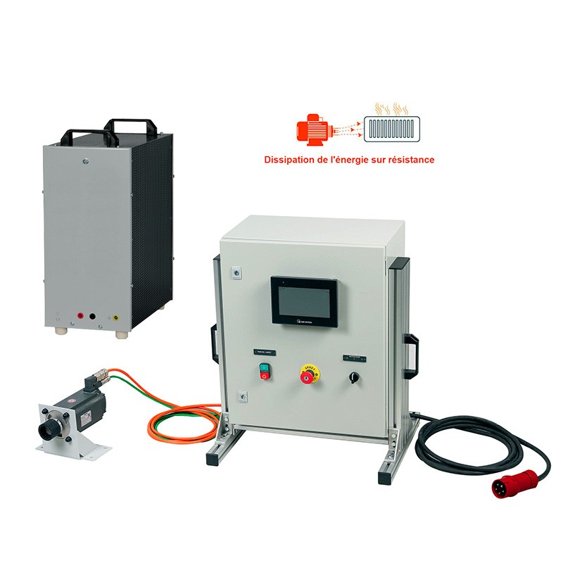 Ce système permet de réaliser des études sur des machines tournantes 1500W (courant alternatif ou continu). Il est composé d’un coffret de commande à poser sur table, et d’un moteur BRUSHLESS SCHNEIDER à intégrer sur un banc d’essai. Celui-ci applique un couple résistif commandé directement par le potentiomètre en face avant du coffret de commande. L’Energie générée par le freinage est dissipée par une résistance de freinage. Il simule une charge sur le moteur étudié en appliquant le profil d’une application industrielle préalablement paramétré depuis l’écran. Il est ainsi possible d’étudier des applications simulant par exemple un treuil de levage, un convoyeur, un malaxeur, une ventilation, une station de pompage, etc…