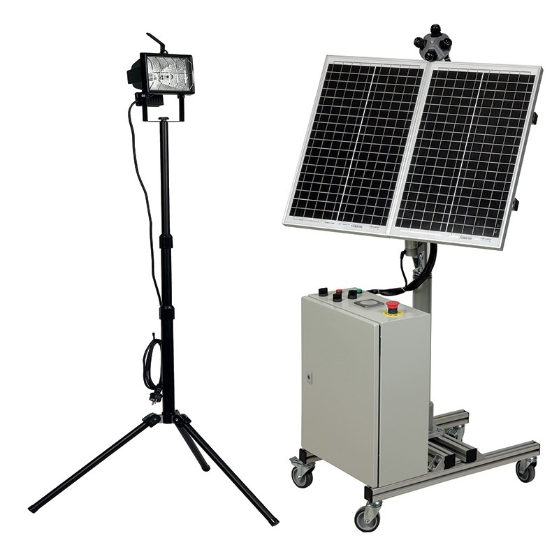 It also allows users to visualize light levels in real time on a graph. TRACSOL2 is completely self-sufficient thanks to batteries recharged by the solar panels. No 230V mains connection is required. Only the artificial solar power source for using TRACSOL2 inside a building is powered by 230 VAC. The voltage from the solar panels is available at two safety terminals.