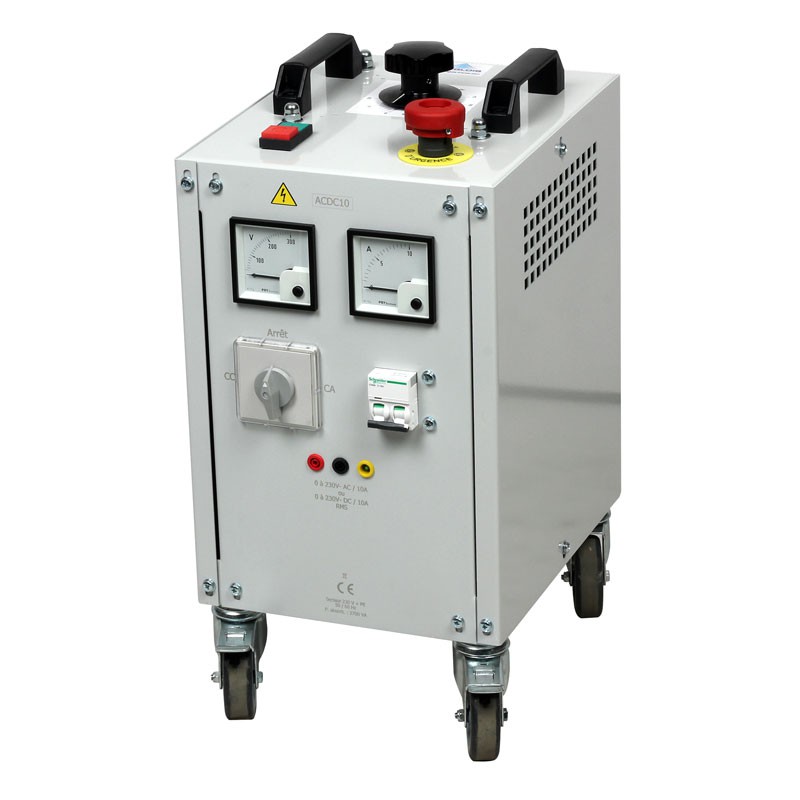 Supply of AC or DC current in 10A max.AC/DC selector switch on the front of the unit. Mains cable of 3 metres with plug.